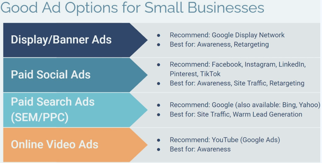 Social media platforms offer affordable and effective advertising options for small businesses. They are best for awareness, site traffic, and retargeting ads.